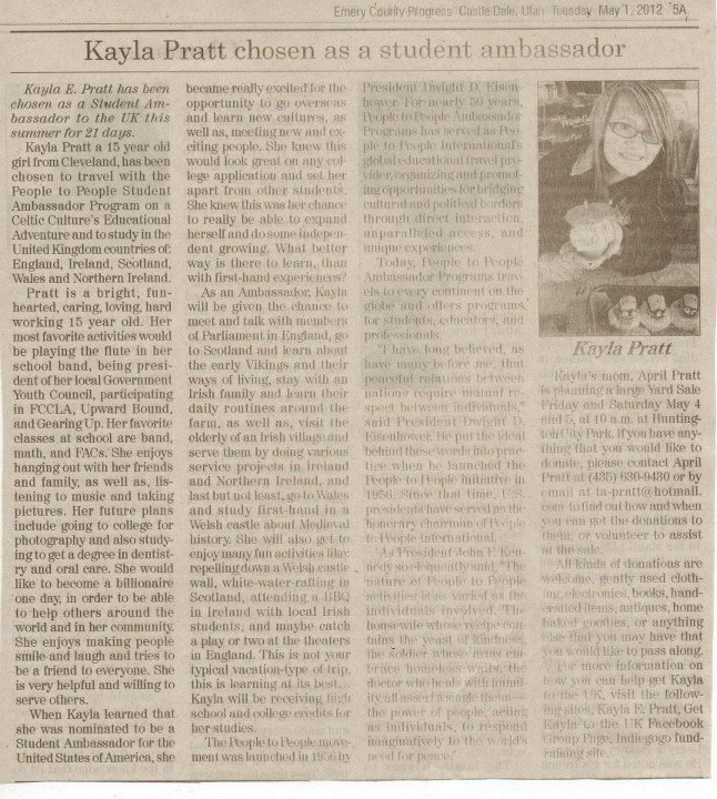 Press ReleaseFOR IMMEDIATE RELEASEKayla E. Pratt has been chosen as a Student Ambassador to the UK this Summer for 21 days.Kayla Pratt a 15 yr. old girl from Cleveland, UT, has been chosen to travel with the People to People Student Ambassador Program on a Celtic Cultures' Educational Adventure and to study in the United Kingdom countries of: England, Ireland, Scotland, Wales and Northern Ireland.Cleveland, UT, April 23, 2012: Kayla is a bright, fun- hearted, caring, loving, hard working 15 year old. Her most favorite activities would be playing the flute in her school band, being president of her local Government Youth Council, participating in FCCLA, Upward Bound, and Gearing Up. Her favorite classes at school are band, math, and FACs. She enjoys hanging out with her friends and family, as well as, listening to music and taking pictures. Her future plans include going to college for photography and also studying to get a degree in dentistry and oral care. She would like to become a billionaire one day, in order to be able to help others around the world and in her community. She enjoys making people smile and laugh and tries to be a friend to everyone. She is very helpful and willing to serve others.When Kayla learned that she was nominated to be a Student Ambassador for the United States of America, she became really excited for the opportunity to go overseas and learn new cultures, as well as, meeting new and exciting people. She knew this would look great on any college application and set her apart from other students. She knew this was her chance to really be able to expand herself and do some independent growing. What better way is there to learn, than with first-hand experiences? As an Ambassador, Kayla will be given the chance to meet and talk with members of Parliament in England, go to Scotland and learn about the early Vikings and their ways of living, stay with an Irish family and learn their daily routines around the farm, as well as, visit the elderly of an Irish village and serve them by doing various service projects in Ireland and Northern Ireland, and last but not least, go to Wales and study first-hand in a Welsh castle about Medieval history. She will also get to enjoy many fun activities like: repelling down a Welsh castle wall, white-water-rafting in Scotland, attending a bbq in Ireland with local Irish students, and maybe catch a play or two at the theaters in England. This is not your typical vacation-type of trip, this learning at its BEST… Kayla will be receiving high school and college credits for her studies.The People to People movement was launched in 1956 by President Dwight D. Eisenhower. For nearly 50 years, People to People Ambassador Programs has served as People to People International's global educational travel provider, organizing and promoting opportunities for bridging cultural and political borders through direct interaction, unparalleled access, and unique experiences. Today, People to People Ambassador Programs travels to every continent on the globe and offers programs for students, educators, and professionals.